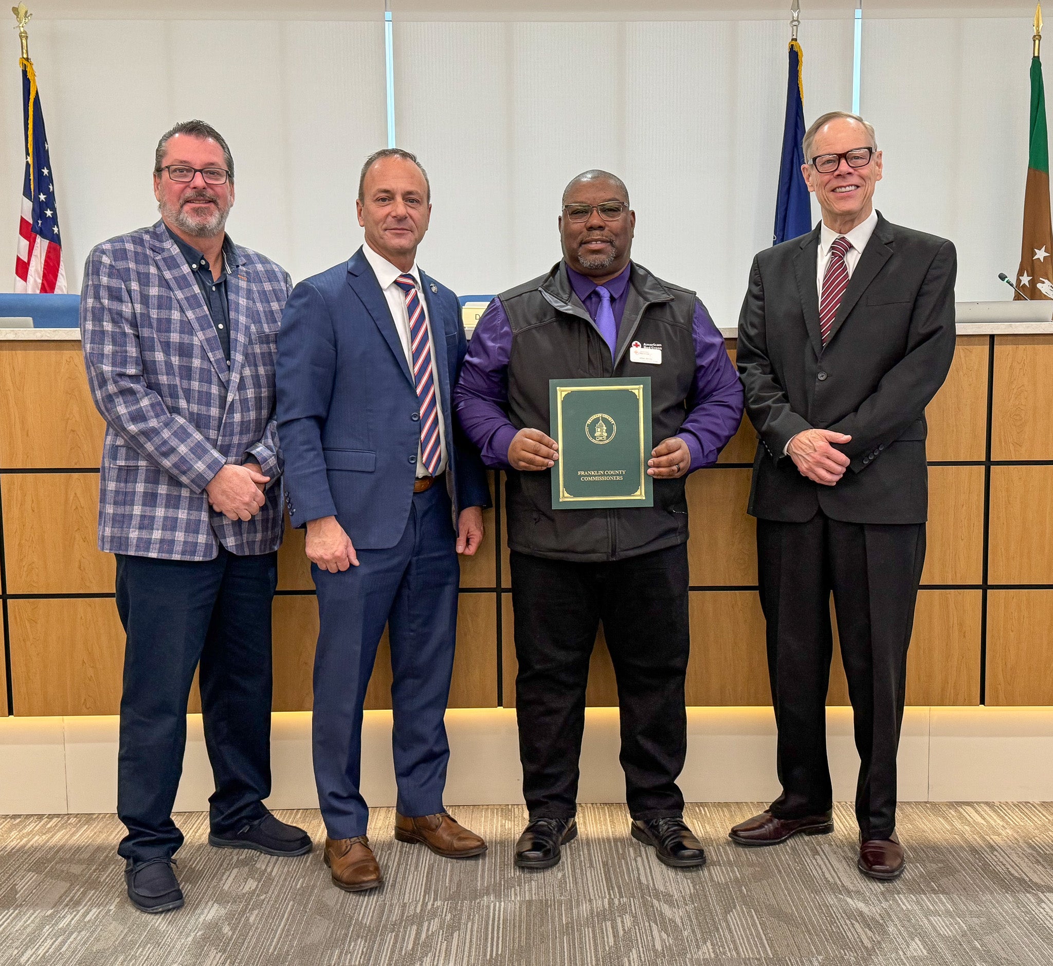 Pictured (from left): Franklin County Commissioner John Flannery, Commissioner Chairman Dean Horst, American Red Cross Community Disaster Program Manager Allen White and Commissioner Bob Ziobrowski
